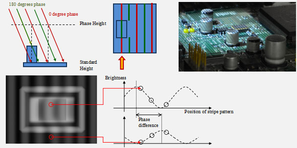 SAKI在線(xiàn)在線(xiàn)AOI自動(dòng)光學(xué)檢測(cè)儀BF-3Di使用多組條紋光系統(tǒng).通過(guò)投射寬窄模式的黑白條紋光,可以穩(wěn)定地精確測(cè)量出各種類(lèi)型元件的高度信息.例如:0402mm元件,黑色的IC本體,以及鏡面材質(zhì)的元件.