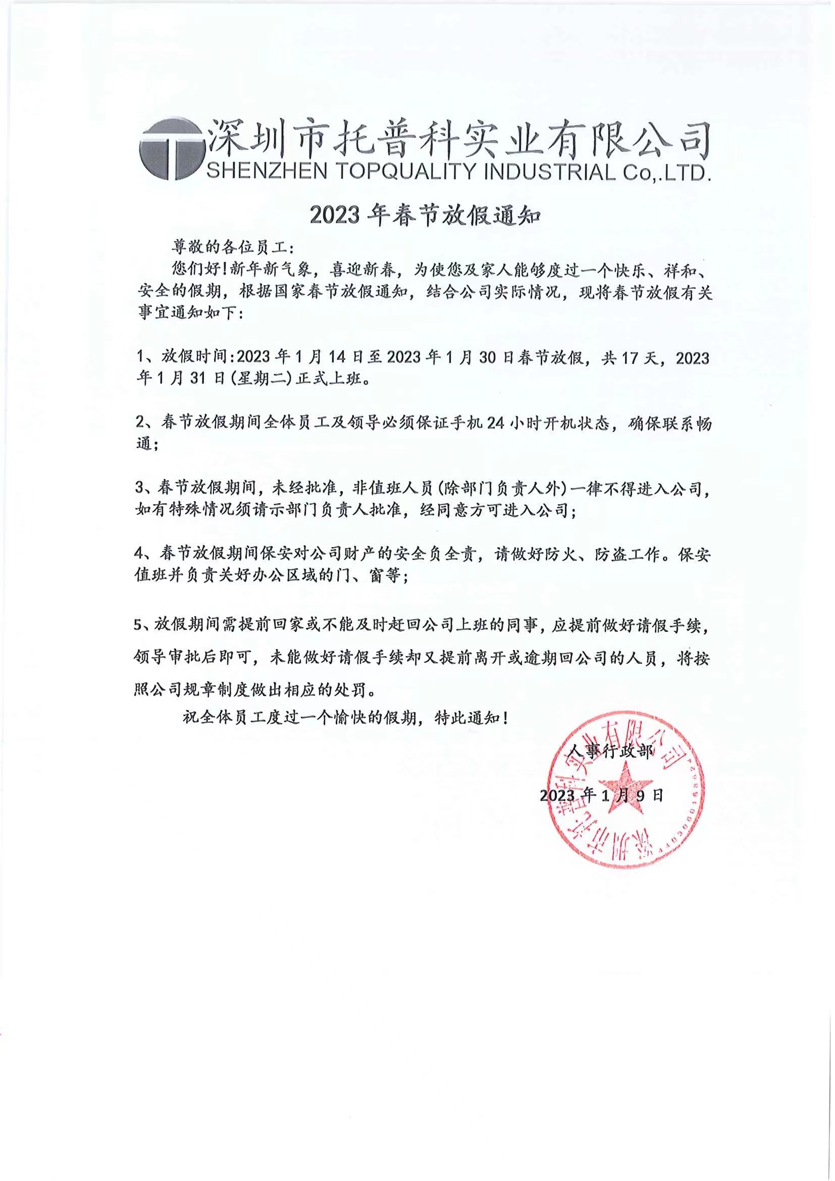 深圳托普科實(shí)業(yè)2023年春節(jié)放假通知