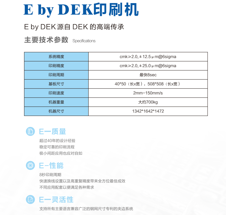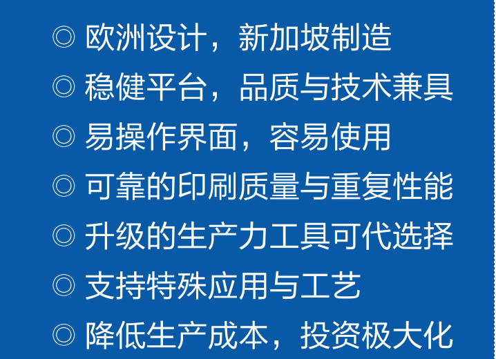 Eby DEK印刷機,歐洲設(shè)計,新加坡制造。穩(wěn)健平臺,品質(zhì)與技術(shù)兼具,易操作界面和容易使用。可靠的印刷質(zhì)量與重復(fù)性能。