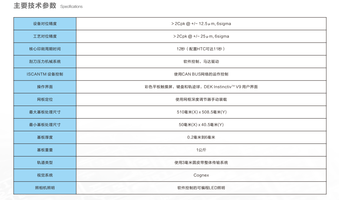 DEK全自動(dòng)絲網(wǎng)印刷機(jī)具有先進(jìn)的上視/下視視覺系統(tǒng),獨(dú)立控制與調(diào)節(jié)的照明高速移動(dòng)的鏡頭。精確地進(jìn)行PCB印刷電路板與網(wǎng)板的對(duì)位,從而將錫膏或紅膠按照網(wǎng)板的開孔精確的涂敷在印刷電路板上。