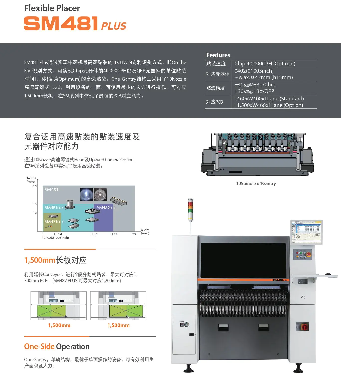 三星/韓華SM481PLUS是一臺(tái)中高速貼片機(jī),SM481PLUS韓華貼片機(jī)主要分布2個(gè)元件識(shí)別區(qū)。 頭部飛行相機(jī)識(shí)別及固定高精度精密相機(jī),單機(jī)可獨(dú)立完成所有產(chǎn)品貼裝。