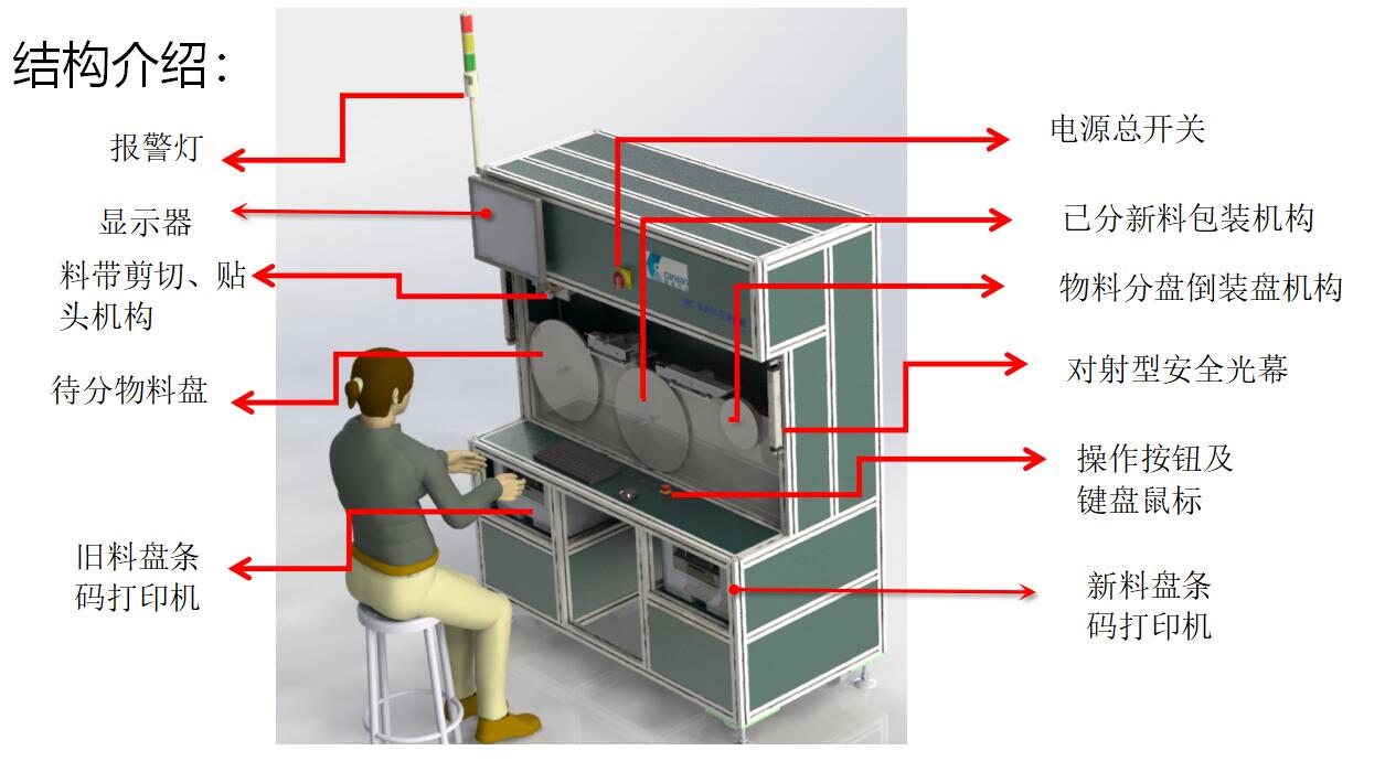 簡介: .通過料盤掃碼自動連接 MES 系統(tǒng),核對并確定分料數(shù)量 .自動精確計數(shù)分盤 ,實現(xiàn)大盤料分小盤料,整數(shù)盤分定數(shù)盤 .自動包裝,減少人員依賴程度,減輕企業(yè)用工負擔。 .自動生成新條形碼打印張貼,便于識別與追溯,提高管理效率